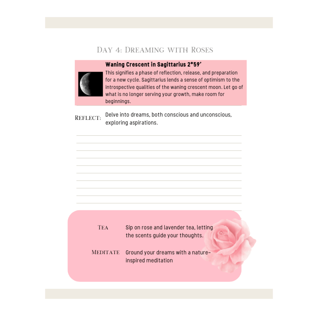 Applying the insights of MORNING DEW to day four, which focuses on Dreaming with Roses, the card encourages us to delve into our dreams with optimism and clarity. In the space created through introspection, release, and harvesting, we find the perfect environment to explore both conscious and unconscious dreams. MORNING DEW urges us to envision our aspirations with a fresh perspective.