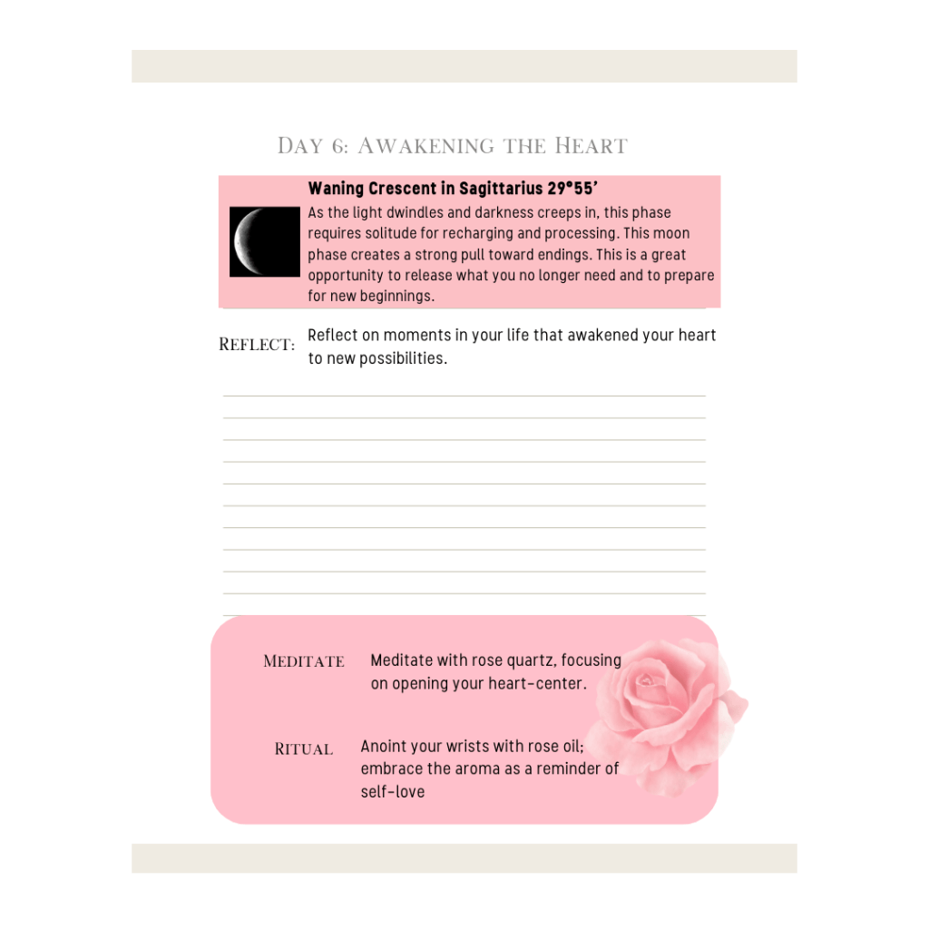 On day 6 of the journey of the rose, we focus on AWAKENING THE HEART. Reflect on those moments in your life that have stirred your heart, opening it to new possibilities.