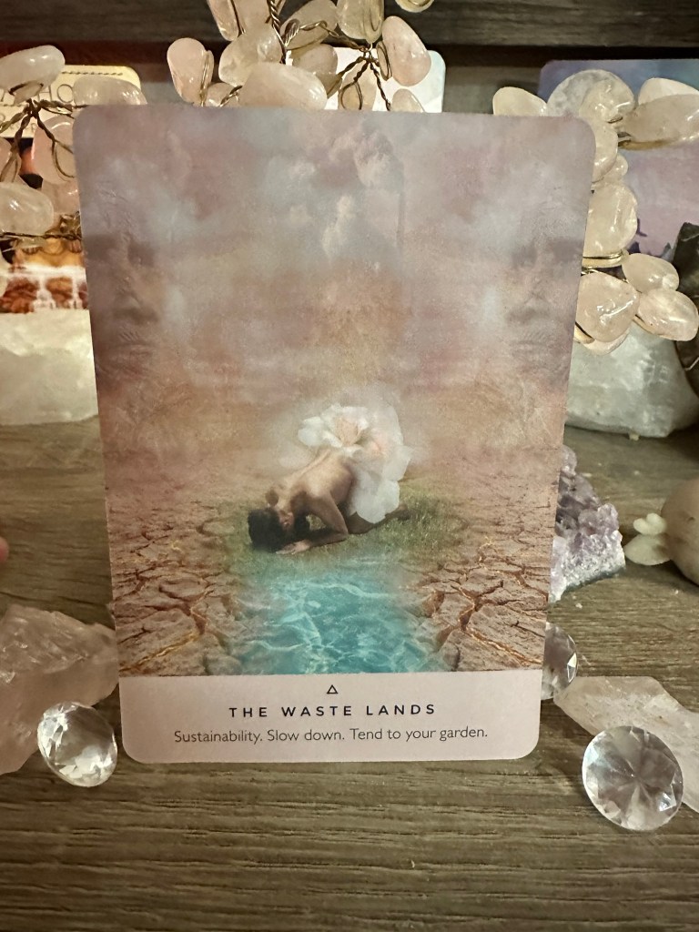 THE WASTE LANDS oracle card feels ominous. It’s a powerful card urging a slowing down and ceasing living in ways that are not sustainable. This is a wake-up call to stop any destructive behavior that is resulting in unsustainability. The Sacred Feminine is abundant and knows that the Earth will provide, she doesn’t need to take or use more than she needs. She maintains balance and nurtures the Earth around and within her.