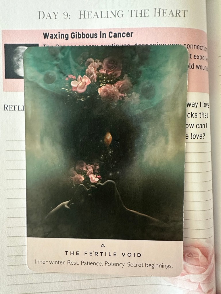 Today’s oracle card is THE FERTILE VOID, carrying the themes of inner winter, rest, patience, and secret beginnings. This card comes as a reminder that healing—especially the healing of the heart—often begins in the quiet, unseen spaces within. Just as the golden seed lies cradled in the dark, fertile womb of the soil, so too do our hearts need moments of stillness and rest to regenerate and heal.