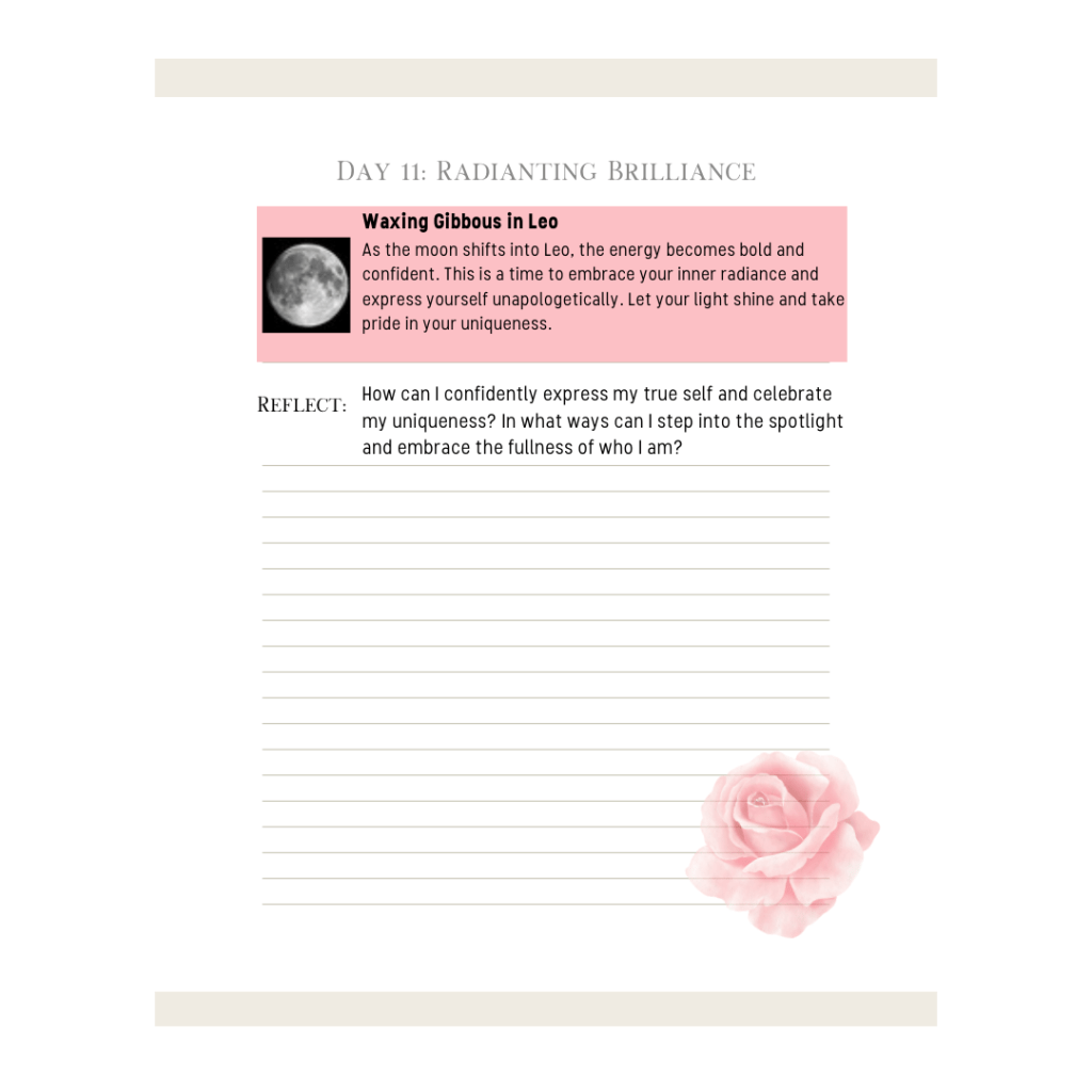 Today we step into Radiating Brilliance, the theme for week three of Sacred Rose. With the moon now in Leo, bold and confident energy flows through the day, inviting you to fully embrace your inner radiance and express yourself unapologetically. This is a time to let your light shine, to honor your uniqueness, and to step into your own personal spotlight.