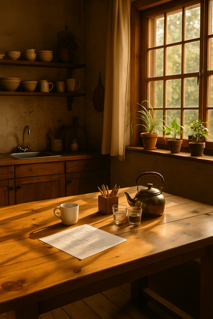 There was a pencil sketch of a floating home on the kitchen table, his rough design from earlier that morning. The kind of quiet project he worked on when his hands needed purpose. He glanced at it now, the lines clean, the fire pit sketched in beside the water. A soft idea for a different kind of life. A shared one.