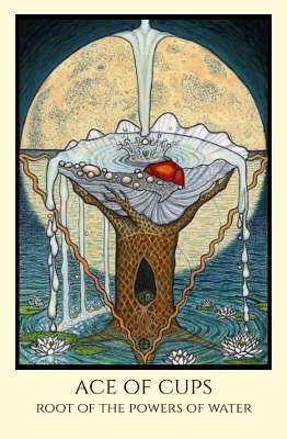 In the image the shell encrusted with jewels is meant to suggest the Grail. The feminine womb from which life emerges. The Ace of Cups is not something outside of us.