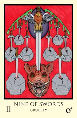 In the Tabula Mundi deck, eight swords are embedded in stone, and the ninth pierces the head of a board. The world Cruelty is emblazoned across the card.